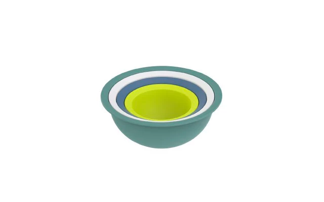 Set mit 3 Schüsseln und einem Sieb – praktisch und schön. In diesem farbenfrohen Set finden Sie platzsparend verstaut alles für den täglichen Gebrauch, was Sie an Schüsseln und Sieb brauchen. Die gerundete Form der Schüssel ist nicht nur zum Kneten von Teig ideal. Zusammen mit dem Sieb erlaubt sie ein direktes Servieren von Salat und Pasta von der Küche auf den gedeckten Tisch. Die Schüsseln haben ein Volumen von 1, 2 und 4,8 Litern, das Sieb hat ein Volumen von 3,2 Litern.