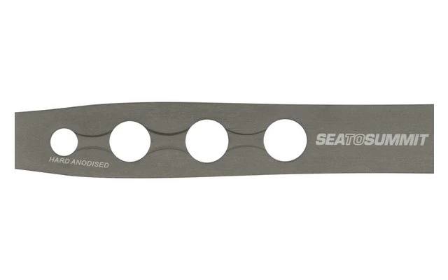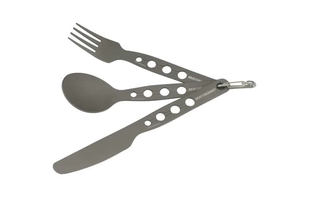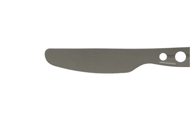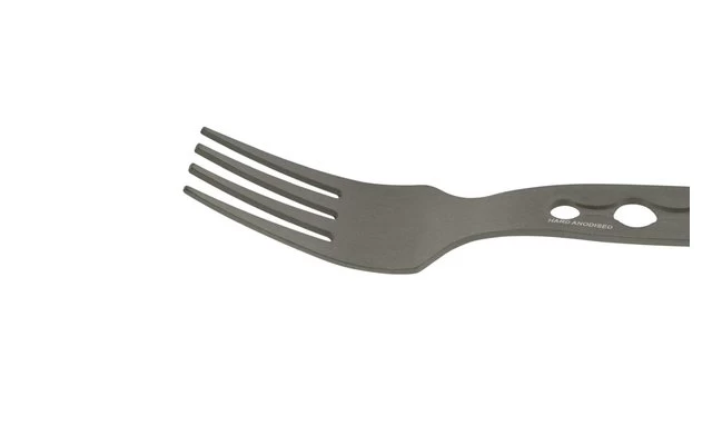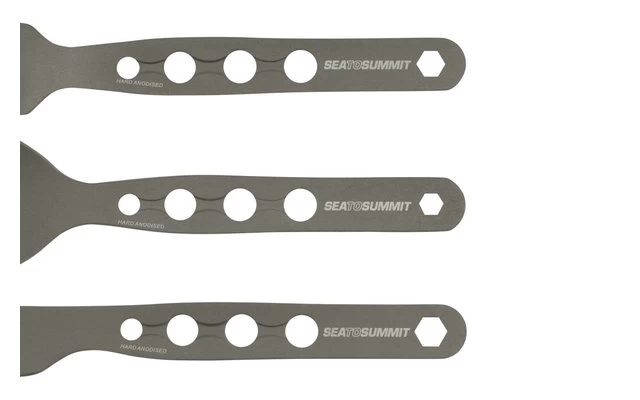 Leichtes und stabiles dreiteiliges Besteck aus hartanodisiertem Aluminium mit eingebauten Sechskant-Werkzeugen.