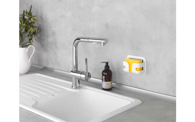 Der dekorative Halter aus weißem Kunststoff ist überall platzierbar und der Schwamm somit immer in Reichweite.